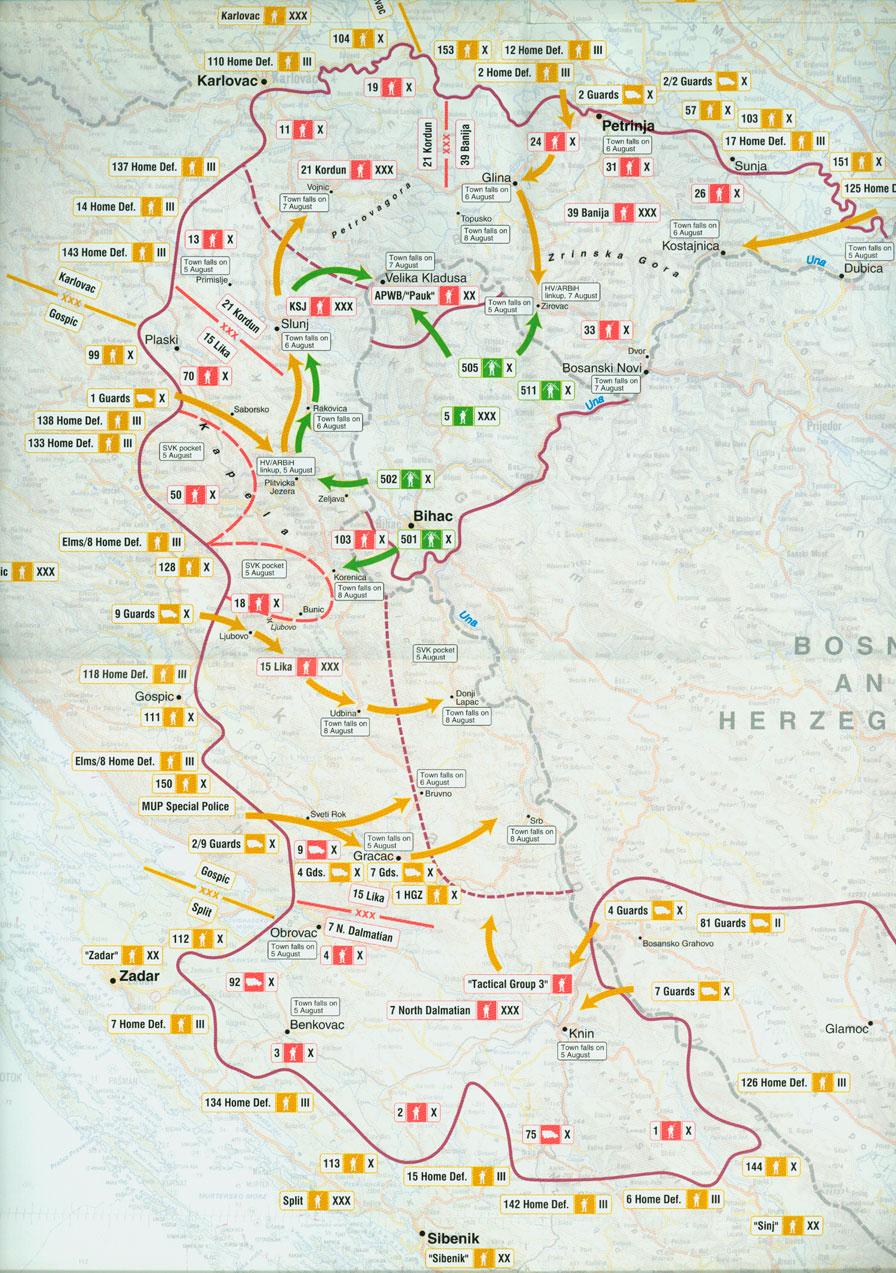 1. Priroda, svrha i tijek akcije. Vojno-redarstvena akcija »Oluja« započela je 4. kolovoza 1995. u 5.00, a trajala je tri i pol dana, do 7. kolovoza 1995. u 18.00. Srpska je vojska priznala poraz činom predaje 8. kolovoza 1995. u 19.00, kada je u Viduševcu zapovjednik tzv. 21. Krajinskog korpusa pukovnik Čedomir Bulat, predajući se, podnio prijavak generalu Hrvatske vojske Petru Stipetiću, priznajući bezuvjetni poraz srpske vojske i neupitnu pobjedu Hrvatske vojske. Poštujući ratna pravila i običaje, zapovjedništvo Hrvatske vojske ostavilo je tom prigodom zarobljenim srpskim vojnicima kratko naoružanje.