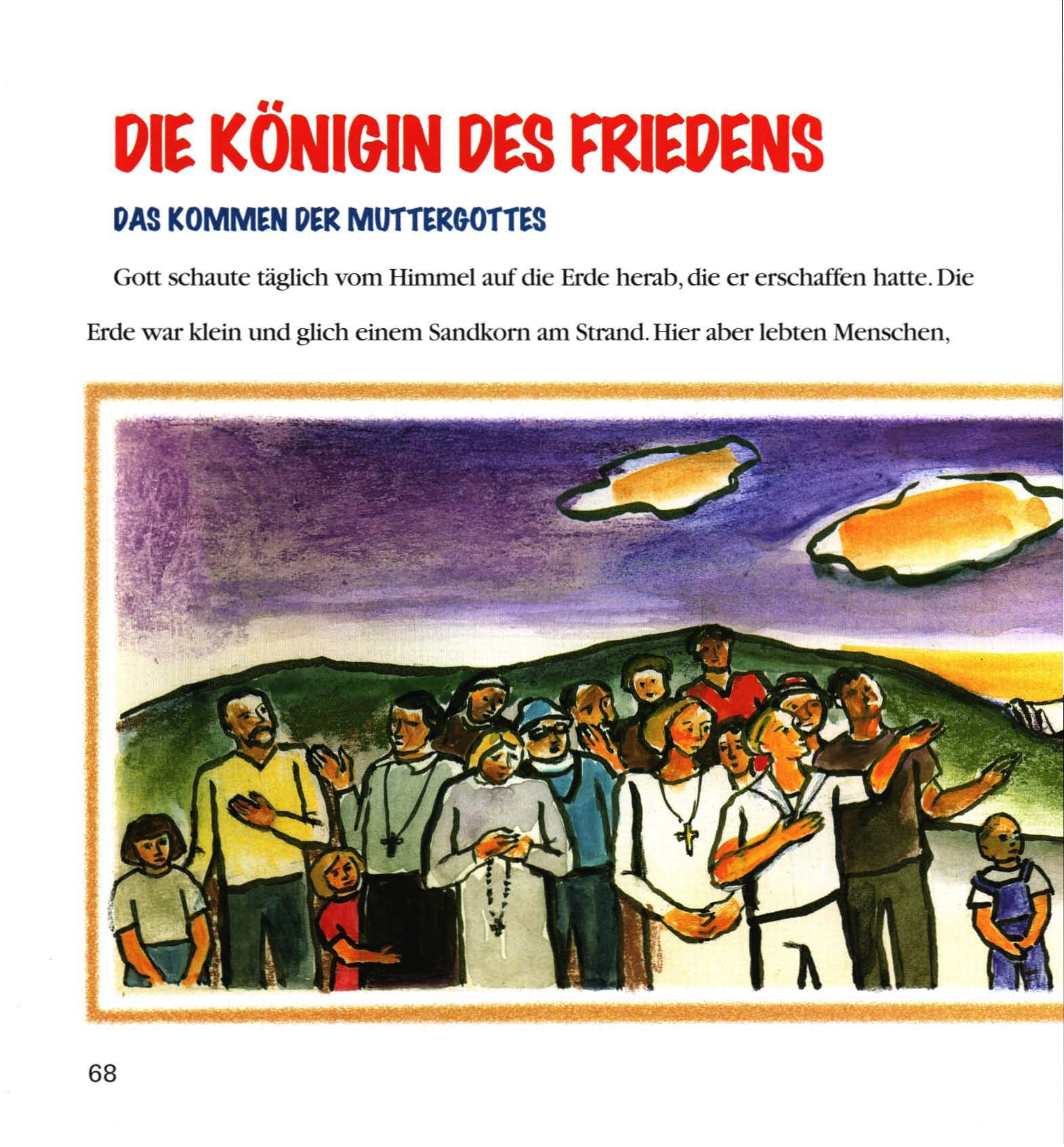 Slikovnica Kraljica Mira Miljenka Stojića izišla je 2000. na njemačkom jeziku u zbirci slikovnica »Meine Engel« koju je objelodanio zajedno s Krešimirom Šegom. Izdavač joj je bio Informativni centar »Mir« Međugorje iz Međugorja. (www.medjugorje.hr)