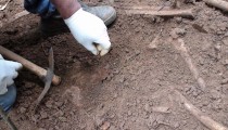 Radimo pozorno, jer se bojimo da ne bismo oštetili posmrtne ostatke. Ipak, trebalo nam je gotovo 3 sata dok smo naišli na prve ostatke kostiju. Morali smo dublje kopati nego na prethodnim dvama grobnicama, jer su škrape vjerojatno bile malo dublje. Ne vjerujemo da ih je netko produbljivao. Komunistima su ubojstva bila važna, a ne bilo kakvo pokapanje.