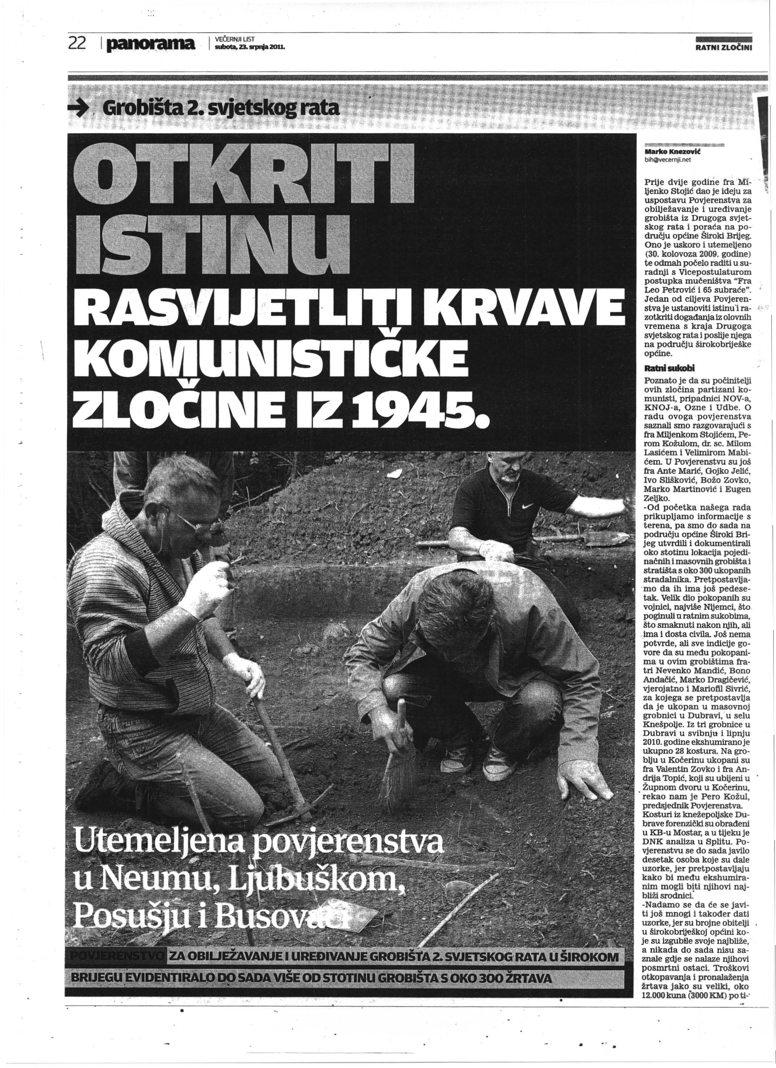 Široki Brijeg, 23. srpnja 2011. (Marko Knezović / Večernji list) – Prije dvije godine fra Miljenko Stojić dao je ideju za uspostavu Povjerenstva za obilježavanje i uređivanje grobišta iz Drugoga svjetskog rata i poraća na području općine Široki Brijeg. Ono je uskoro i utemeljeno (30. kolovoza 2009.) te odmah počelo raditi u suradnji s Vicepostulaturom postupka mučeništva »Fra Leo Petrović i 65 subraće«. Jedan od ciljeva Povjerenstva je ustanoviti istinu i razotkriti događanja iz olovnih vremena s kraja Drugoga svjetskog rata i poslije njega na području širokobriješke općine.