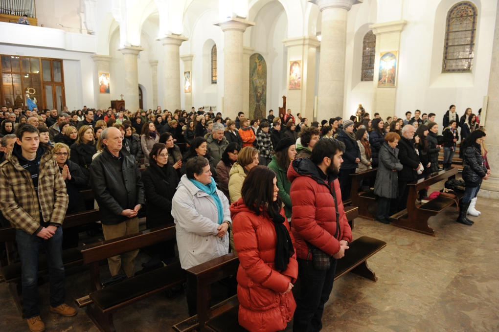 Široki Brijeg, 6. veljače 2012. (Gojko Jelić / Vicepostulatura) – Svetu misu zadušnicu druge večeri 2. dana pobijenih hercegovačkih franjevaca predslavio je fra Miljenko Stojić u suslavlju s fra Vitomirom Musom, fra Danom Karačićem, fra Vendelinom Karačićem i fra Vinom Ledušićem. Misna čitanja i liturgijsko pjevanje animirali su članovi širokobriješke Frame. Ove večeri na sv. misi je sudjelovao veliki broj vjernika, koji je došao uglavnom pješice na Gospin brijeg probijajući se još uvijek teško prohodnim putevima.