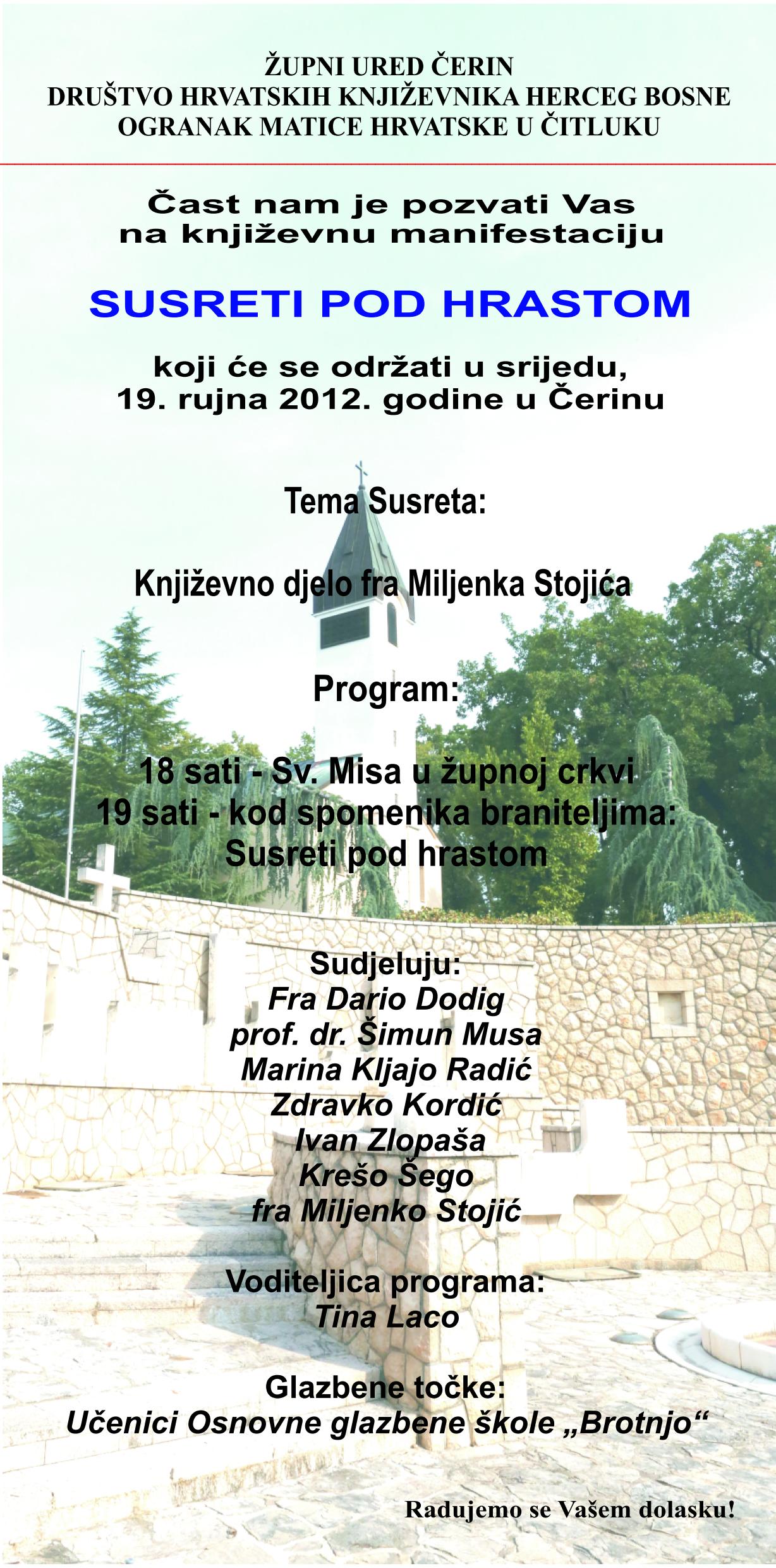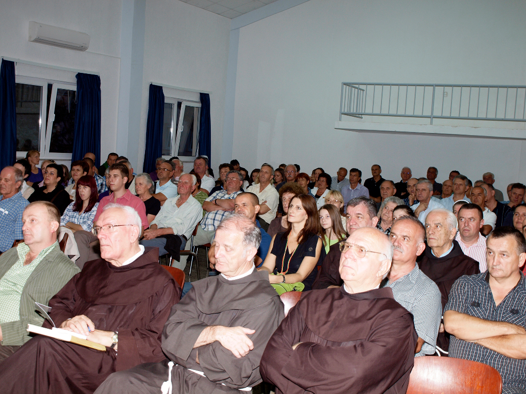 Čerin, 20. rujna 2012. (Marin Jurković / hrsvijet.net) – Dvorana katehetskog centra u župi sv. Stjepana na Čerinu bila je pretijesna da primi sve one koji su u srijedu navečer, 19. rujna, željeli nazočiti književnoj manifestaciji »Susreti pod hrastom« koja je ove godine posvećena pisanoj riječi hercegovačkog franjevca i književnika fra Miljenka Stojića.