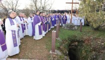 Široki Brijeg, 8. siječnja 2013. (Gojko Jelić / Vicepostulatura) – Onoga krvavog 7. veljače 1945. jednog po jednog od dvanaest fratara komunisti su vodili od samostana do ratnog skloništa, ubili i zapalili. Tom istom stazom, 68 godina poslije, krenula je procesija ministranata, postulanata, novaka, redovnika i svećenika uz molitvu žalosnih otajstava Gospine krunice. U dostojanstvenom ozračju framaši su zapjevali Gospodine, ti si pastir moj, a vicepostulator fra Miljenko Stojić pročitao je ulomak iz knjige o Jobu. Nakon kratkog nagovora i molitve gvardijana fra Sretana Ćurčića procesija je, uz molitvu krunice, ušla u crkvu te zastala na grobu 22 ubijena fratra. Svjetovni franjevci pročitali su tada kratko razmatranje i imena svih pobijenih hercegovačkih franjevaca.