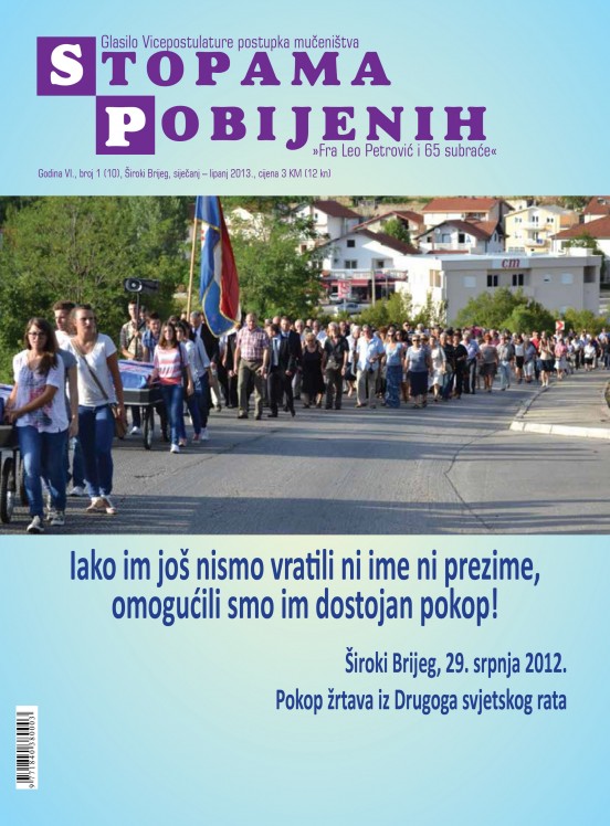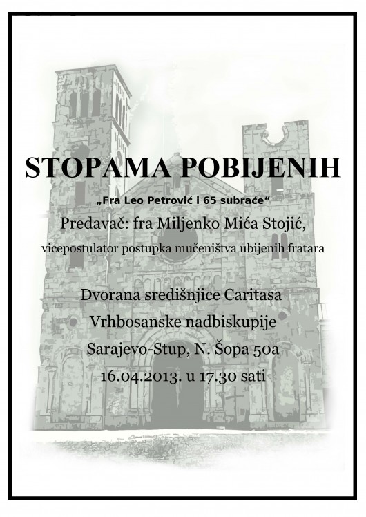 Sarajevo, 15. travnja 2013. (caritas-sarajevo.ba) – Caritas Vrhbosanske nadbiskupije u Godini vjere, organizira u utorak 16. travnja 2013. s početkom u 17.30. tribinu s naslovom »Fra Leo Petrović i 65 subraće«. Tribina će se održati u dvorani Caritasove Središnjice (Sarajevo-Stup, ul. Nikole Šopa 50a). Predavač će biti fra Miljenko Stojić, vicepostulator postupka mučeništva pobijenih hercegovačkih franjevaca.