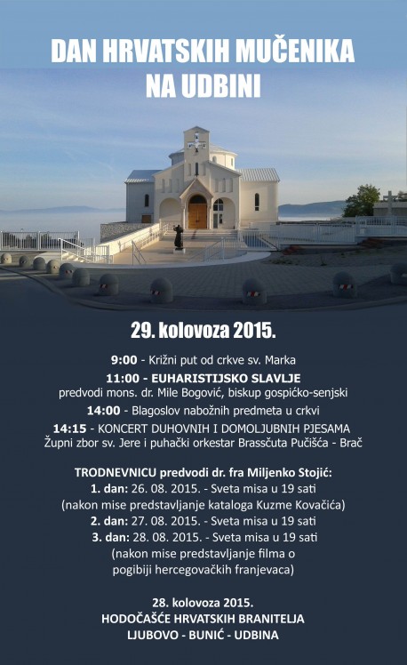 Udbina, 24. kolovoza 2015. (Ivana Karačić) – U subotu, 29. kolovoza, na Udbini će se svečano proslaviti Dan hrvatskih mučenika. Proslava počinje križnim putem s Krbavskog polja i crkve Sv. Marka Groba, a predvodit će ga fra Miljenko Stojić uz sestre milosrdnice čija će predstavnica s. Veronika Popić i ove godine prinijeti svijeću u procesiji. Svečano misno slavlje, u 11.00, predslavit će biskup Mile Bogović. Na proslavi se očekuje oko 10.000 hodočasnika.