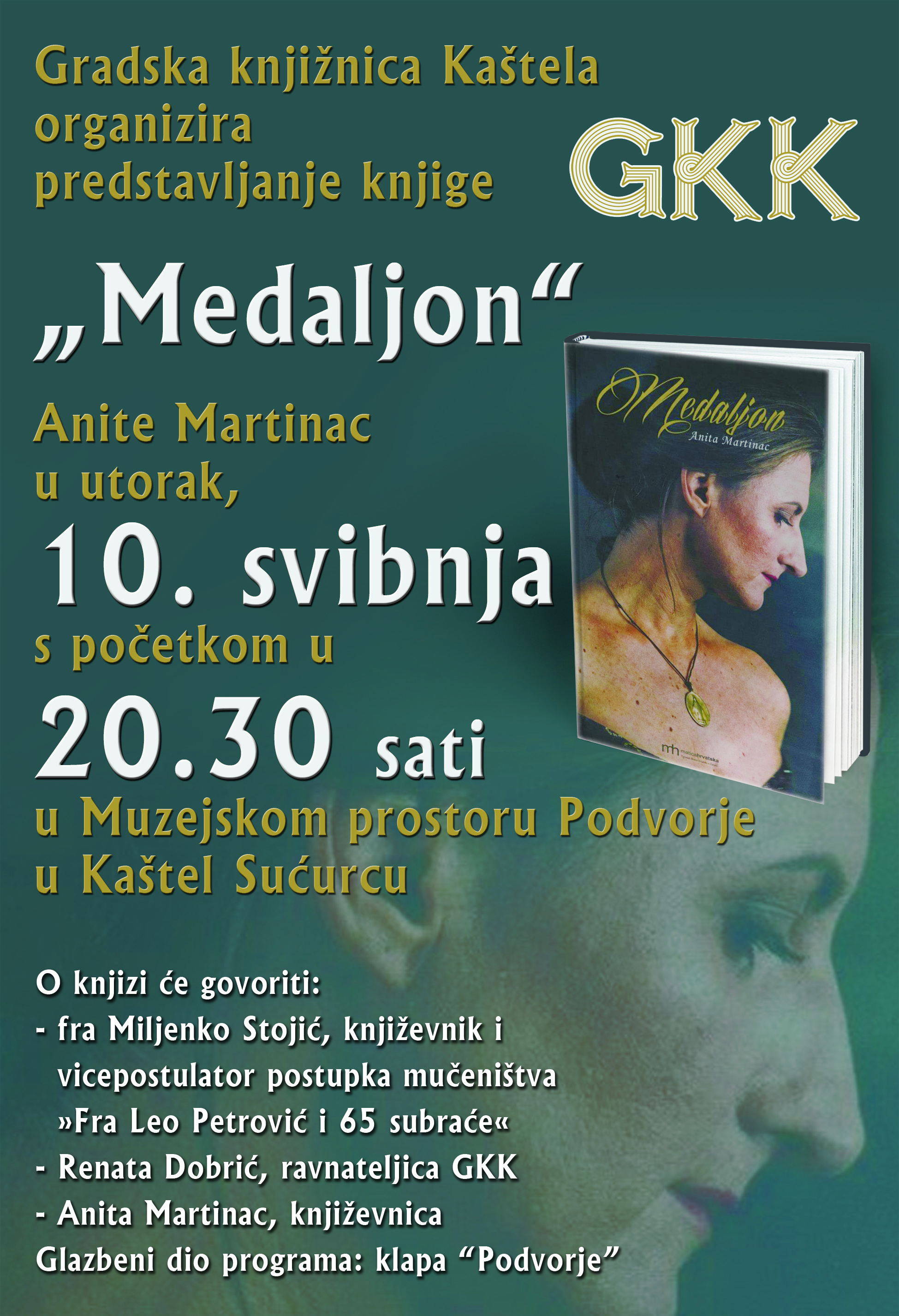 Kaštel Sućurac, 6. svibnja 2016. (M. M. / hrsvijet.net) – Gradska knjižnica Kaštela (GKK) u utorak, 10. svibnja, s početkom u 20.30 u Muzejskom prostoru Podvorje u Kaštel Sućurcu organizira predstavljanje romana »Medaljon« autorice Anite Martinac. O njemu će govoriti: fra Miljenko Stojić, književnik i vicepostulator postupka mučeništva »Fra Leo Petrović i 65 subraće«, Renata Dobrić, ravnateljica GKK i autorica Anita Martinac. U glazbenom dijelu programa nastupit će muška klapa »Podvorje«.