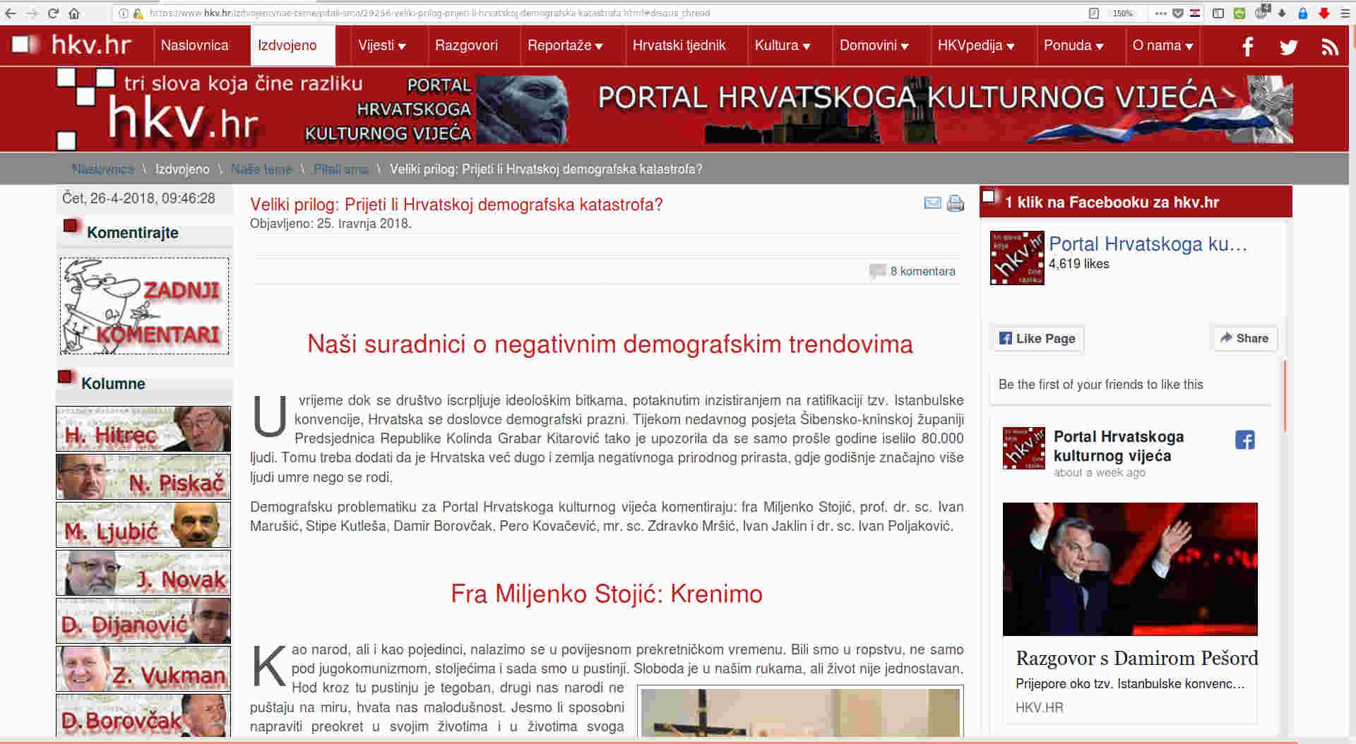 Demografsku problematiku za Portal Hrvatskoga kulturnog vijeća komentiraju: fra Miljenko Stojić, prof. dr. sc. Ivan Marušić, Stipe Kutleša, Damir Borovčak, Pero Kovačević, mr. sc. Zdravko Mršić, Ivan Jaklin i dr. sc. Ivan Poljaković.
