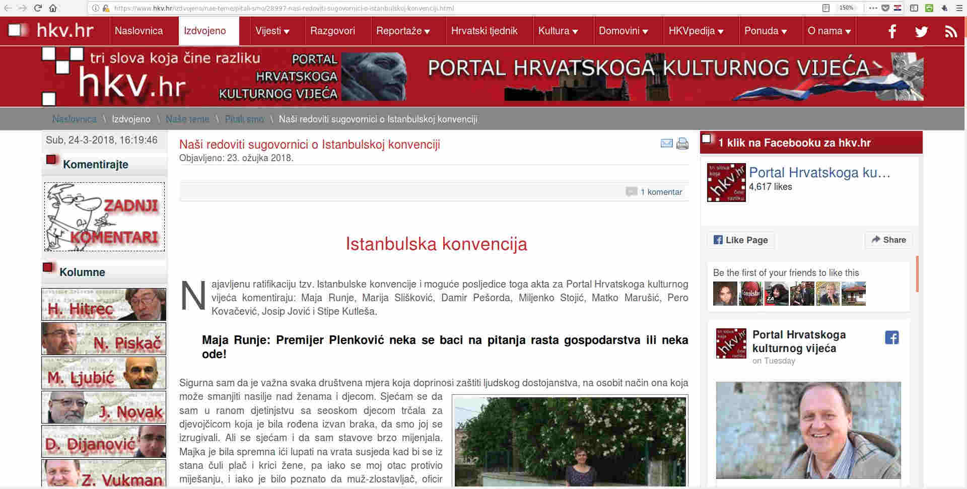 Zagreb, 23. ožujka 2018. (hkv.hr) – Najavljenu ratifikaciju tzv. Istanbulske konvencije i moguće posljedice toga akta za Portal Hrvatskoga kulturnog vijeća komentiraju: Maja Runje, Marija Slišković, Damir Pešorda, Miljenko Stojić, Matko Marušić, Pero Kovačević, Josip Jović i Stipe Kutleša.