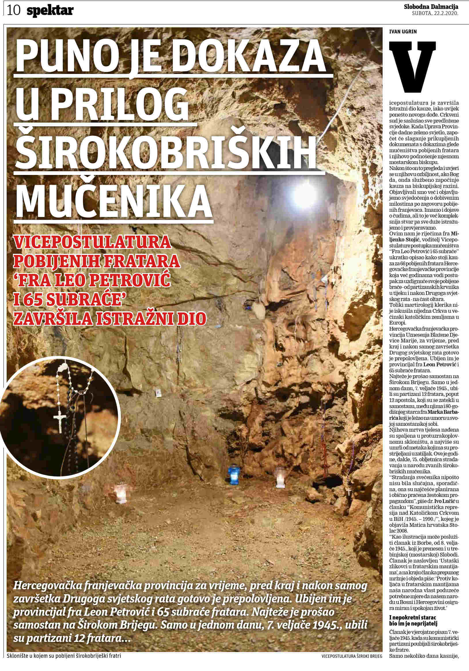 Split, 24. veljače 2020. (Ivana Karačić) – U Slobodnoj je Dalmaciji u subotu, 22. veljače, na duplerici izišao članak o radu Vicepostulature postupka mučeništva »Fra Leo Petrović i 65 subraće«. Napisao ga je Ivan Ugrin pod naslovom »Puno je dokaza u prilog širokobriških mučenika«. Fra Miljenko Stojić, vicepostulator, u toj je prigodi između ostaloga naglasio kako je Vicepostulatura završila istražni dio postupka mučeništva te se čeka zeleno svjetlo od Uprave Provincije za slaganje prikupljenih dokumenata s dokazima i njihovo podnošenje mjesnom biskupu. Kad biskup to pregleda i uvjeri se u njihovu ozbiljnost, trebao bi službeno započeti postupak mučeništva na biskupijskoj razini.