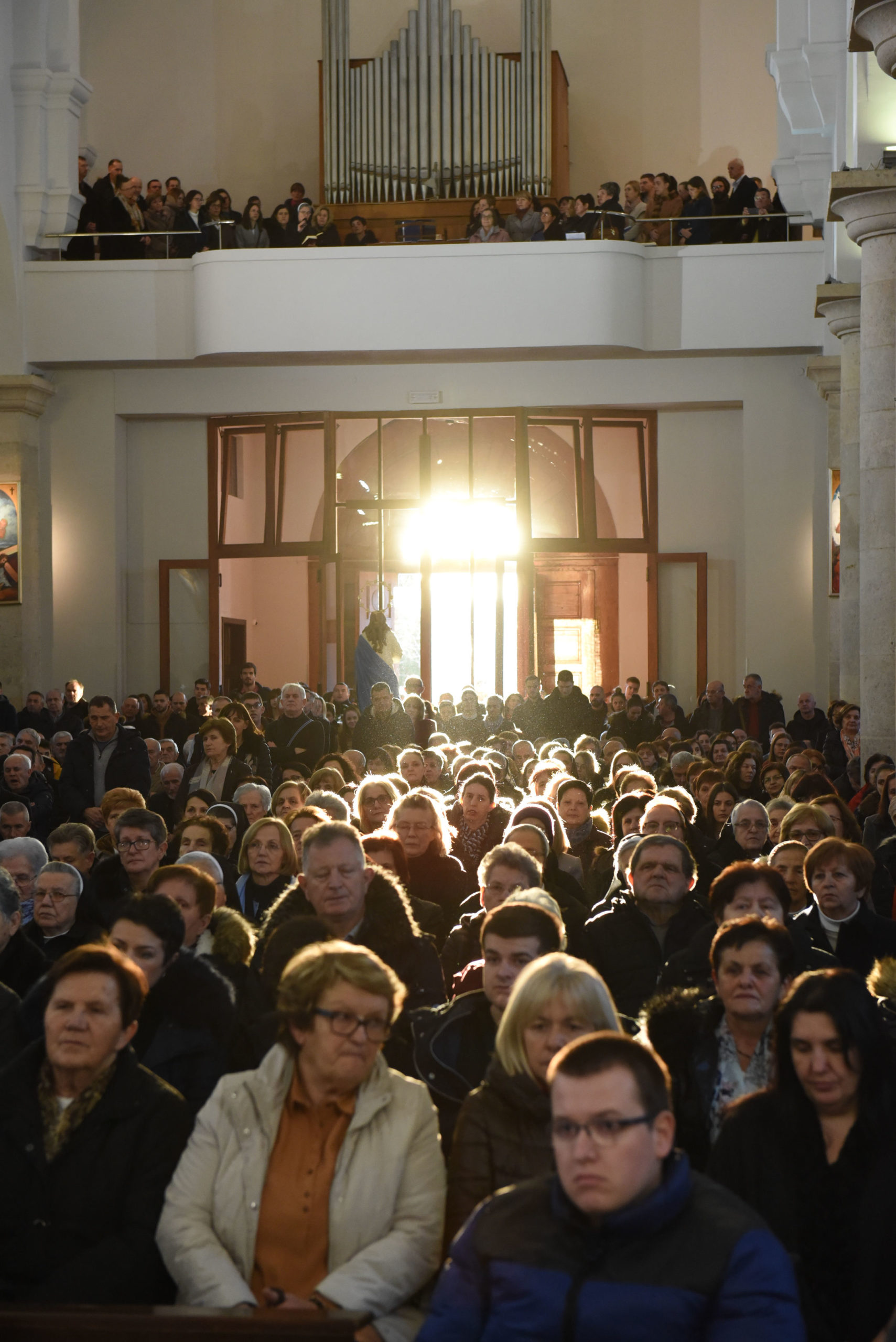 Široki Brijeg, 6. veljače 2020. (Ivana Karačić) – Večeras je u samostanskoj crkvi Uznesenja BDM na Širokom Brijegu nastavljen molitveni program »X. dana pobijenih hercegovačkih franjevaca« u prigodi 75. obljetnice njihova ubojstva. Molitva krunice uobičajeno je započela u 17.30, a zatim je u 18.00 uslijedila sv. misa zadušnica koju je predslavio don Filip Kucelin, postulator postupka mučeništva »Don Eugen Šutrin i drugovi«, uz sumisništvo vicepostulatora fra Miljenka Stojića i fratara iz širokobriješkog samostana. Prostrana samostanska crkva bila je ispunjena vjernicima.