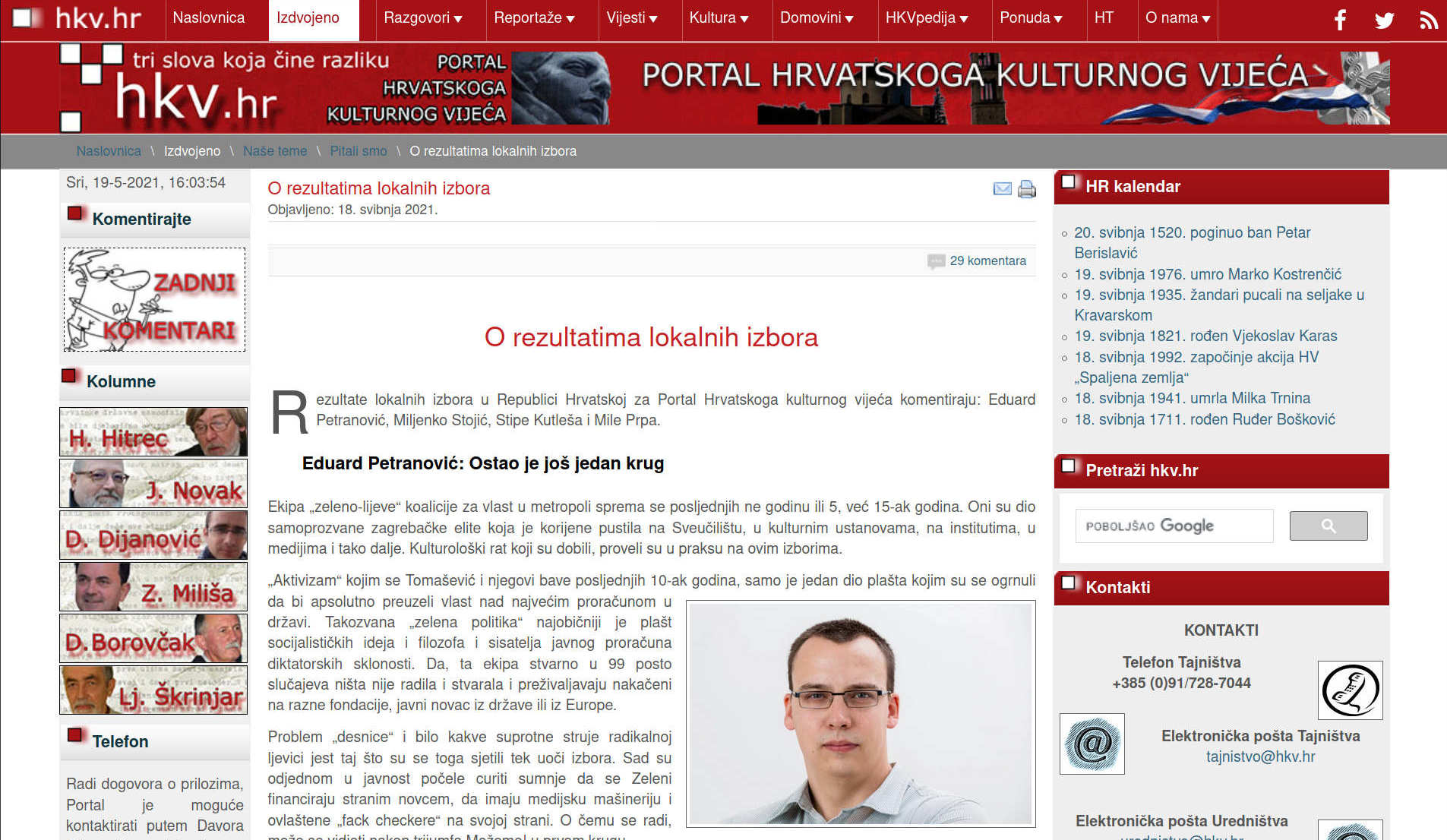 Zagreb, 18. svibnja 2021. (hkv.hr) – Rezultate lokalnih izbora u Republici Hrvatskoj za Portal Hrvatskoga kulturnog vijeća komentiraju: Eduard Petranović, Miljenko Stojić, Stipe Kutleša i Mile Prpa.