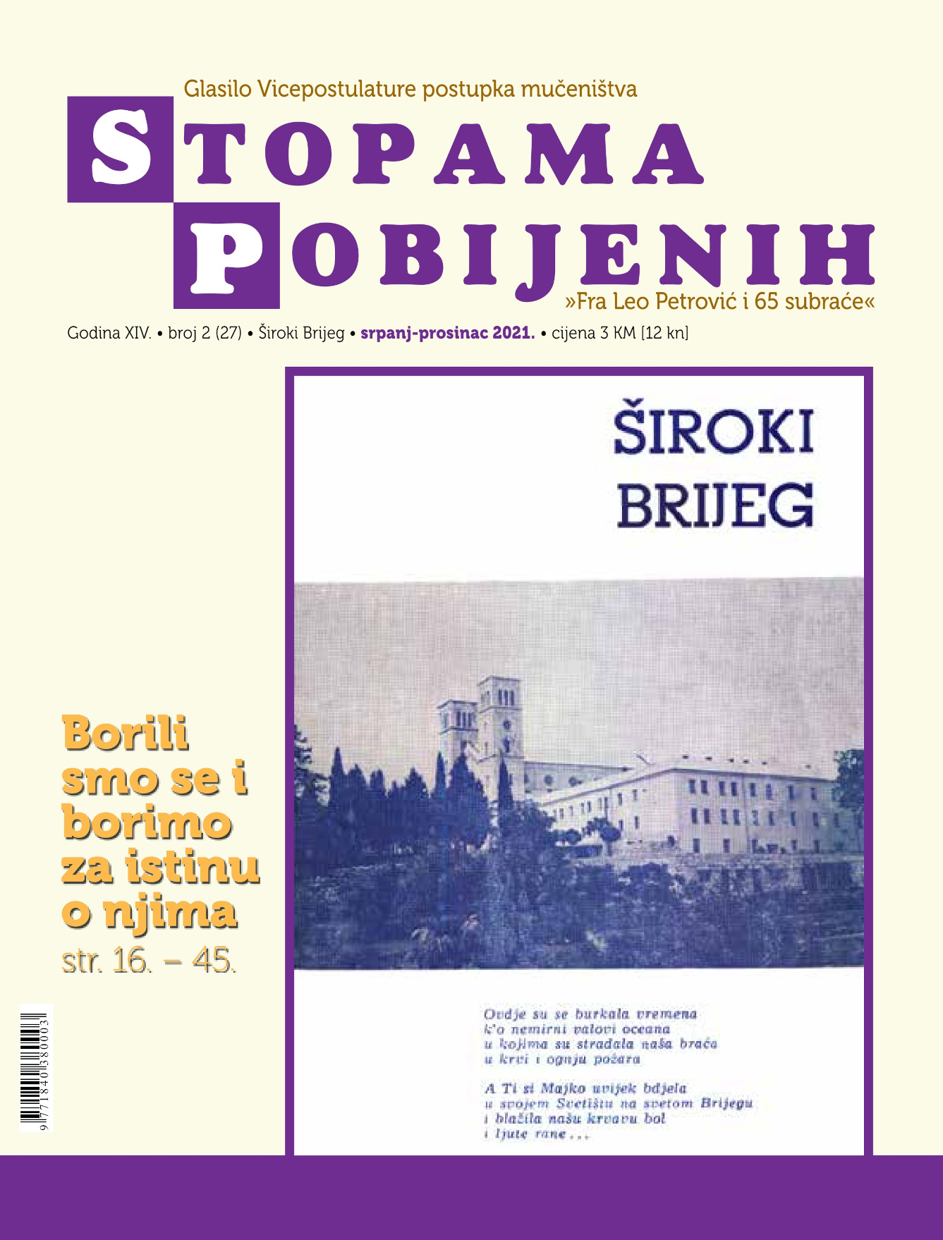 Široki Brijeg, 27. srpnja 2021. (Lucijana Kožul) – Ovih dana iz tiska je izišao 27. broj glasila Stopama pobijenih. Glavni urednik mu je vicepostulator fra Miljenko Stojić. Već 14 godina Vicepostulatura postupka mučeništva »Fra Leo Petrović i 65 subraće« u skladu sa svojim poslanjem skrbi se za istinu o pobijenim hercegovačkim franjevcima te o povijesnom kontekstu u kojemu se to dogodilo što na vidjelo dana iznosi i istinu o pobijenim članovima vjernoga puka Božjega.