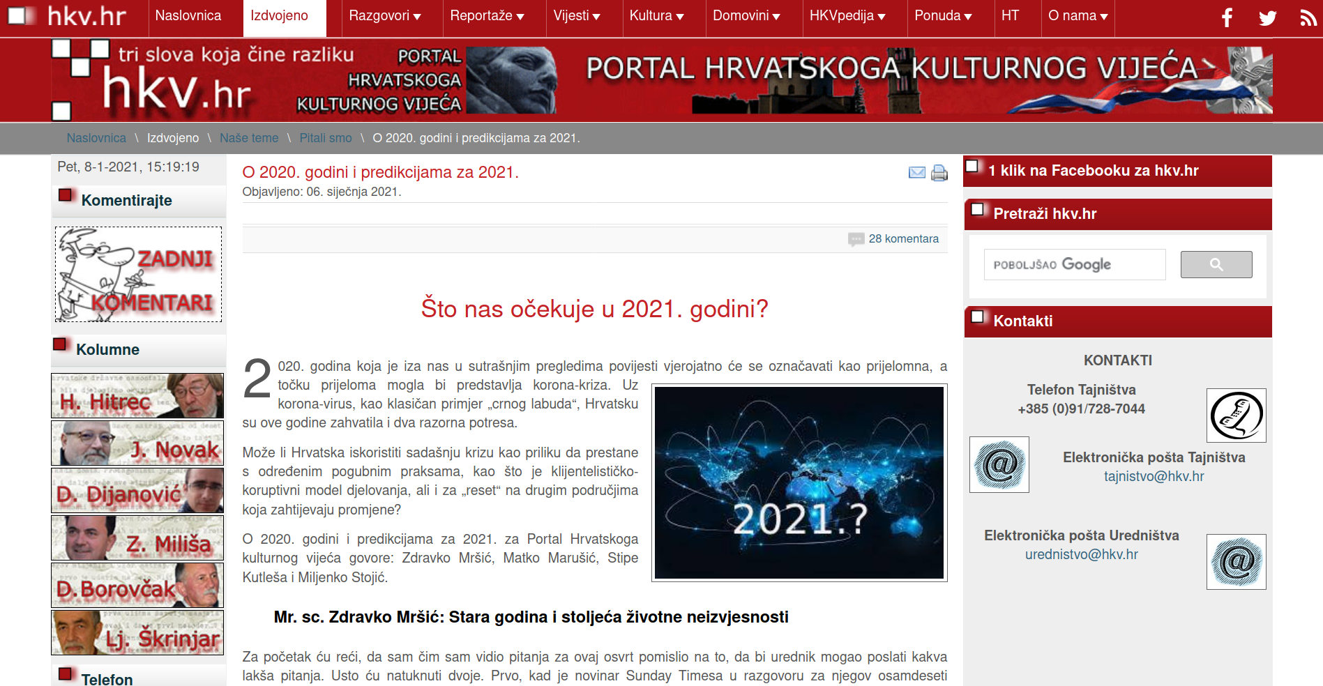 O 2020. i predikcijama za 2021. za Portal Hrvatskoga kulturnog vijeća govore: Zdravko Mršić, Matko Marušić, Stipe Kutleša i Miljenko Stojić.
