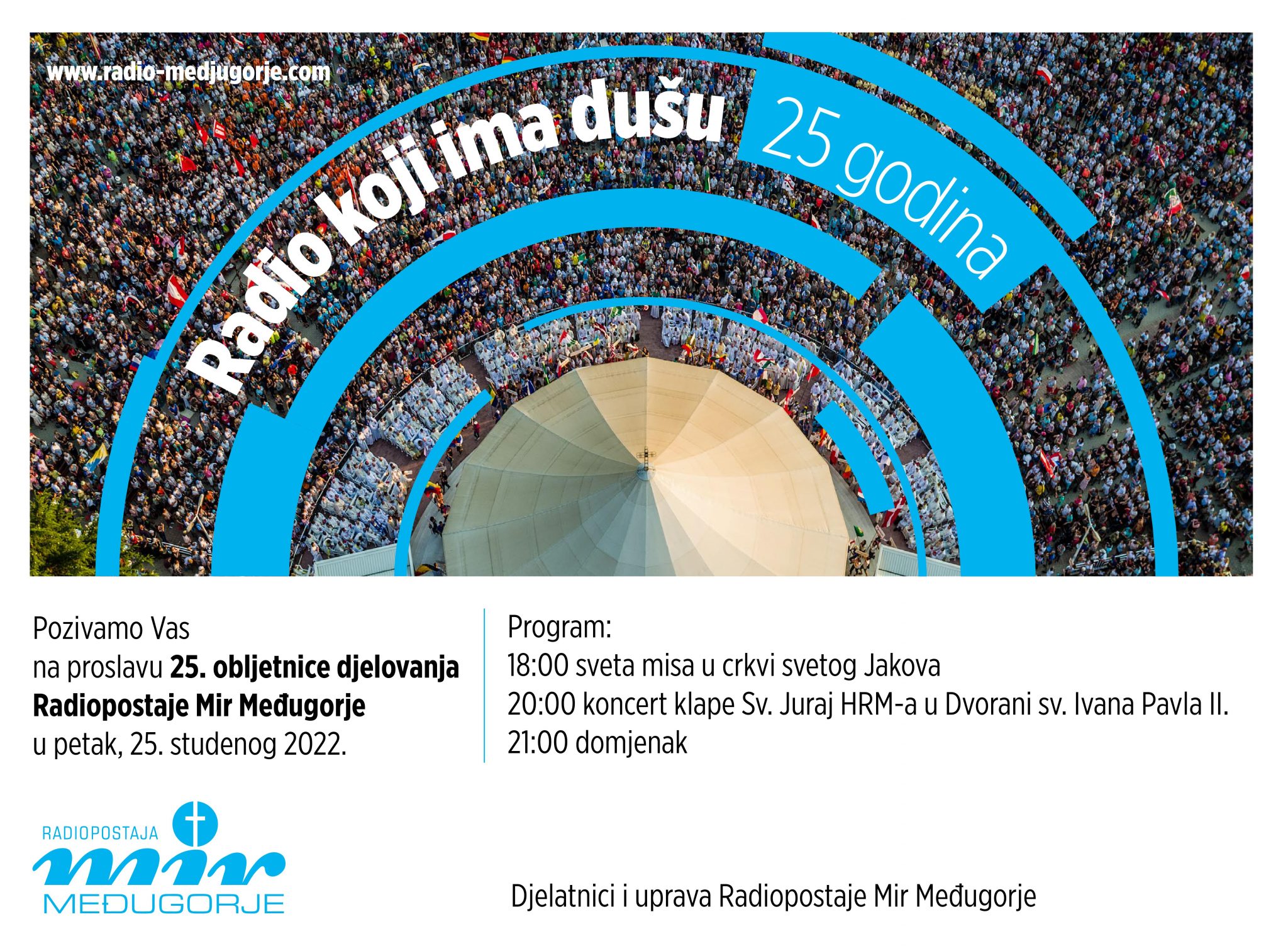 Međugorje, 21. studenoga 2022. (Velimir Begić / radio-medjugorje.com) – U petak, 25. studenoga, proći će točno 25 godina otkako je u programu Radiopostaje »Mir« Međugorje 1997. fra Miljenko Mića Stojić, kao pokretač i ravnatelj, izgovorio prve riječi: »Hvaljen Isus i Marija, dragi slušatelji, nalazite se na valovima Radiopostaje Mir Međugorje, na frekvenciji 100,1 MHz«. Od tada se radiopostaja neprestano širi i sadržajno, i odašiljačima, i ljudima… slijedeći potrebe svojih slušatelja.