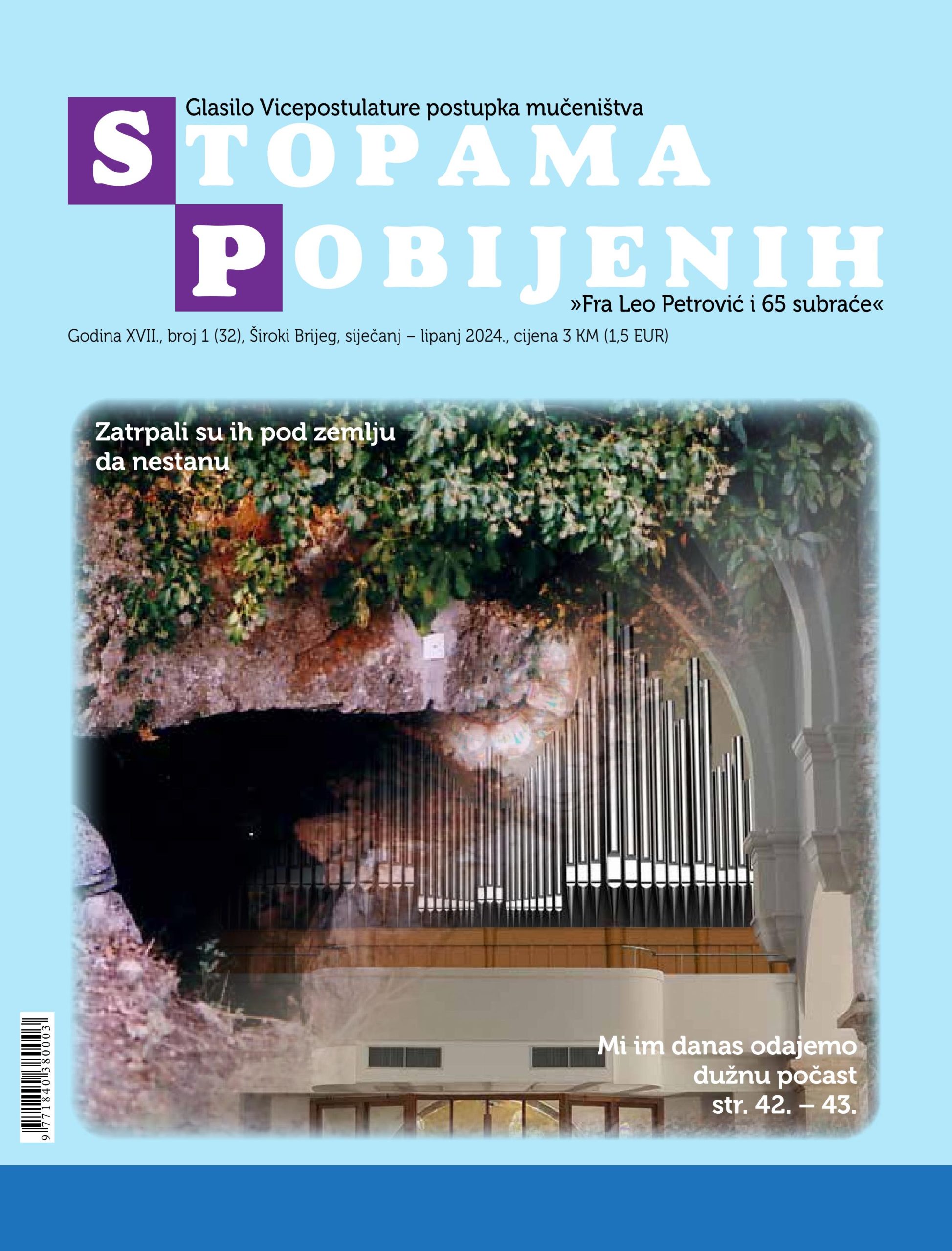 Široki Brijeg, 23. siječnja 2024. (Lucijana Kožul) – Iz tiska je izašao 32. broj glasila »Stopama pobijenih«. Izdaje ga Vicepostulatura postupka mučeništva »Fra Leo Petrović i 65 subraće«, a glavni mu je i odgovorni urednik vicepostulator fra Miljenko Stojić. Glasilo donosi bogatstvo građe koja osvjetljava živote pobijenih hercegovačkih franjevaca i okolnosti u kojima se sve događalo, kao i sudbinu mnogobrojnoga puka Božjega.
