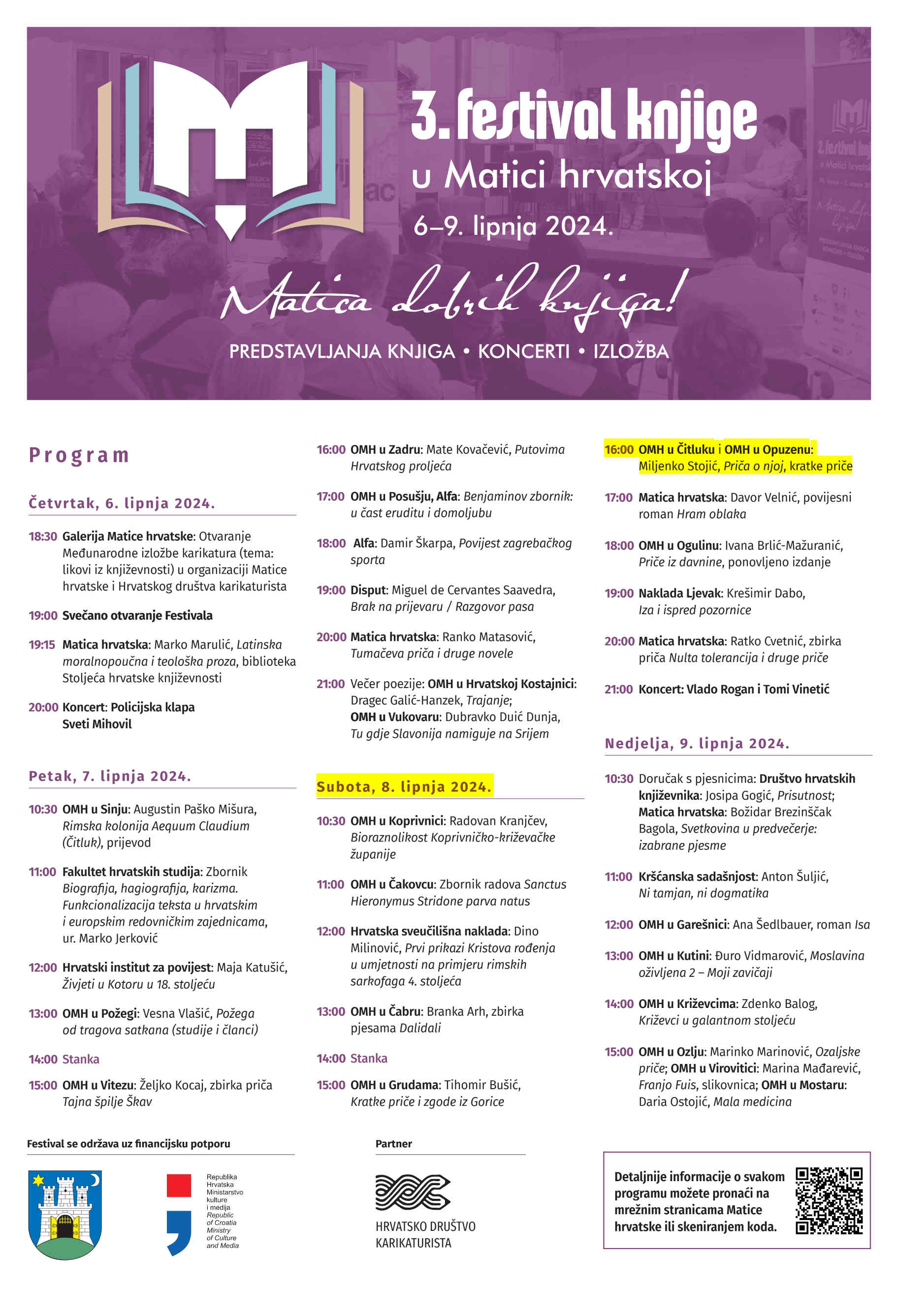 Zagreb, 1. lipnja 2024. (Ivana Karačić / matica.hr) – U Matici hrvatskoj (MH) 6 – 9. lipnja održava se Treći festival knjige pod sloganom »Matica dobrih knjiga«. Uz predstavljanja novih naslova Matičinih ogranaka iz svih dijelova Lijepe naše, na Festivalu će sudjelovati i ogranci iz BiH, kao i gosti: nakladničke kuće Alfa, Disput, Društvo hrvatskih književnika, Fakultet hrvatskih studija Sveučilišta u Zagrebu, Hrvatska sveučilišna naklada, Hrvatski institut za povijest, a ove godine i Kršćanska sadašnjost te Naklada Ljevak.