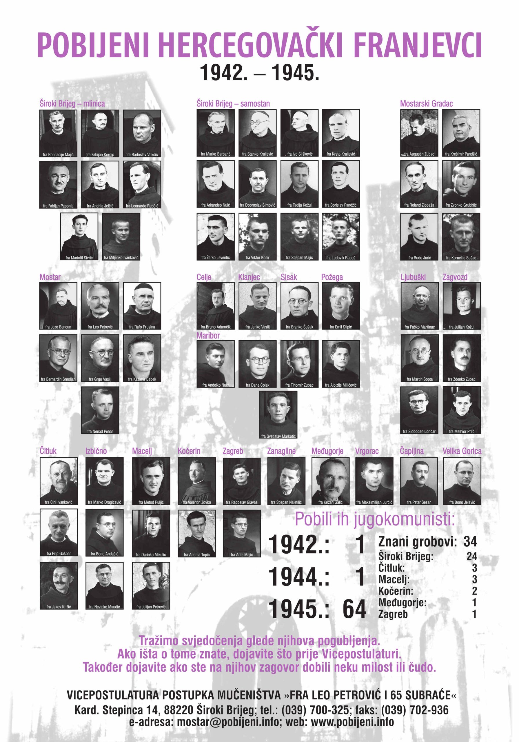Široki Brijeg, 29. siječnja 2025. (Lucijana Kožul) – Na Širokom će Brijegu 31. siječnja – 7. veljače biti održani »Dani pobijenih hercegovačkih franjevaca« (Dani) u povodu 80. obljetnice jugokomunističkog ubojstva 66 hercegovačkih franjevaca u Drugom svjetskom ratu i poraću te mnoštva članova vjernoga puka Božjega. Priređuje ih Vicepostulatura postupka mučeništva »Fra Leo Petrović i 65 subraće«, na čelu s vicepostulatorom fra Miljenkom Stojićem.